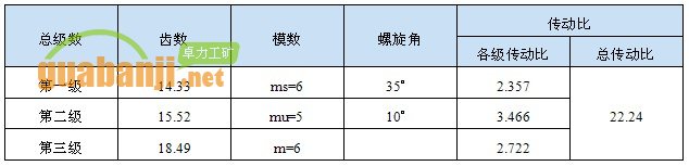 JS-30型減速器為三級減速,漸開線齒輪傳動。總傳動為22.24。第一級為圓弧錐齒輪,第二級為圓柱斜齒輪,第三級為圓柱直齒輪。
