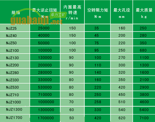 例如:代號NJZ 330-S-280,表示NJZ型接觸式逆止器,額定逆止力矩為330000 N.m,內圈轉向順時針,安裝孔直徑280mm。